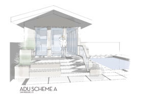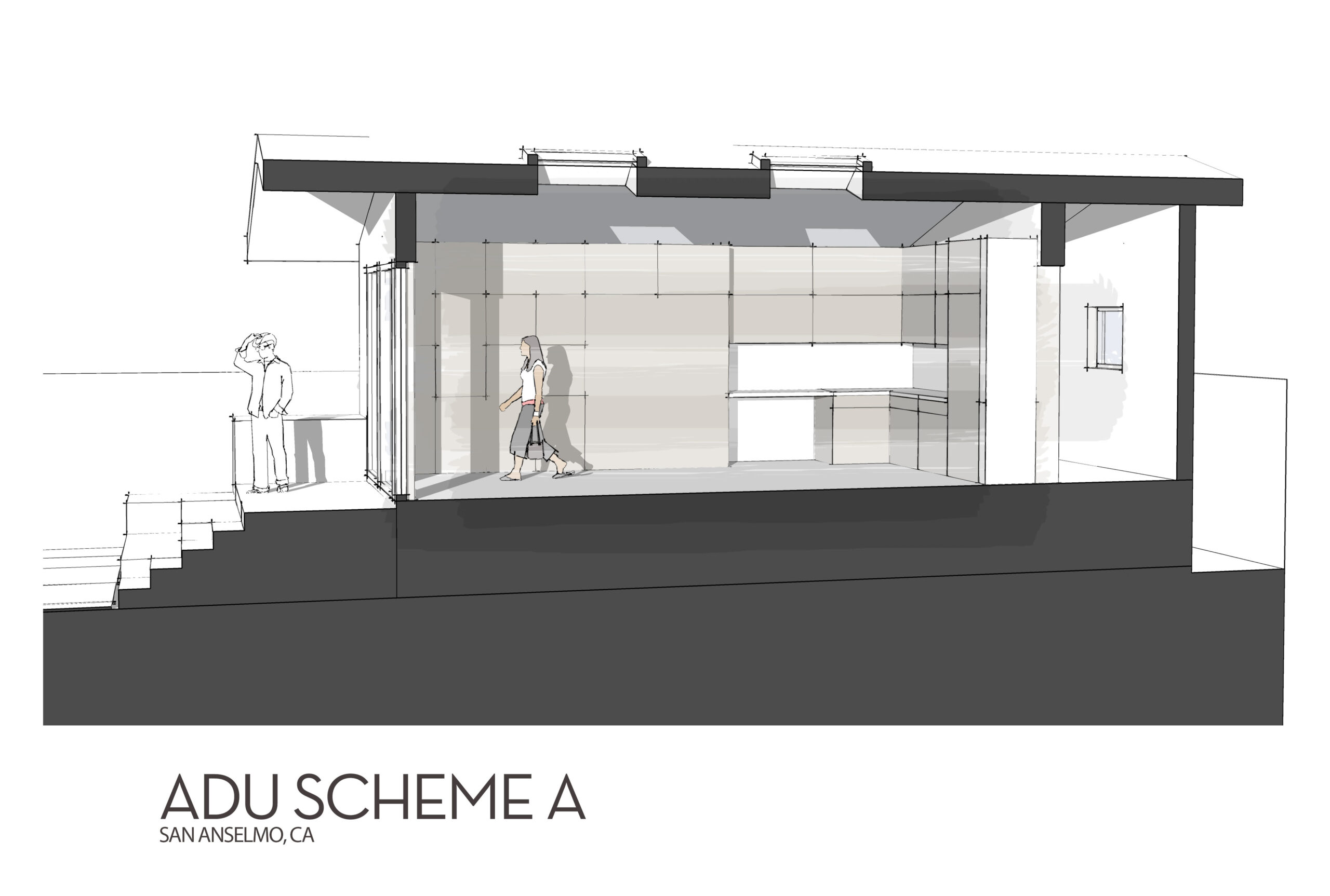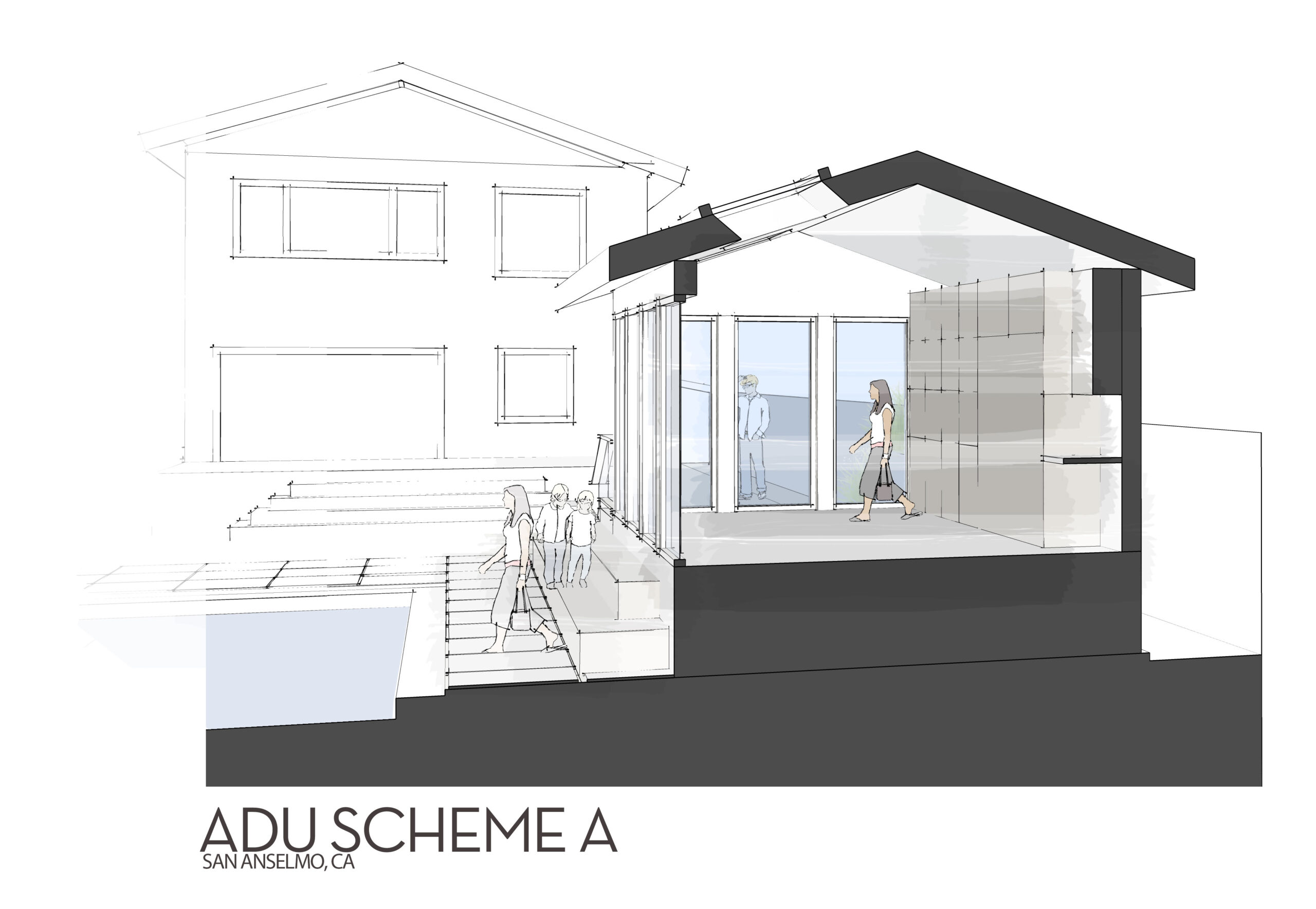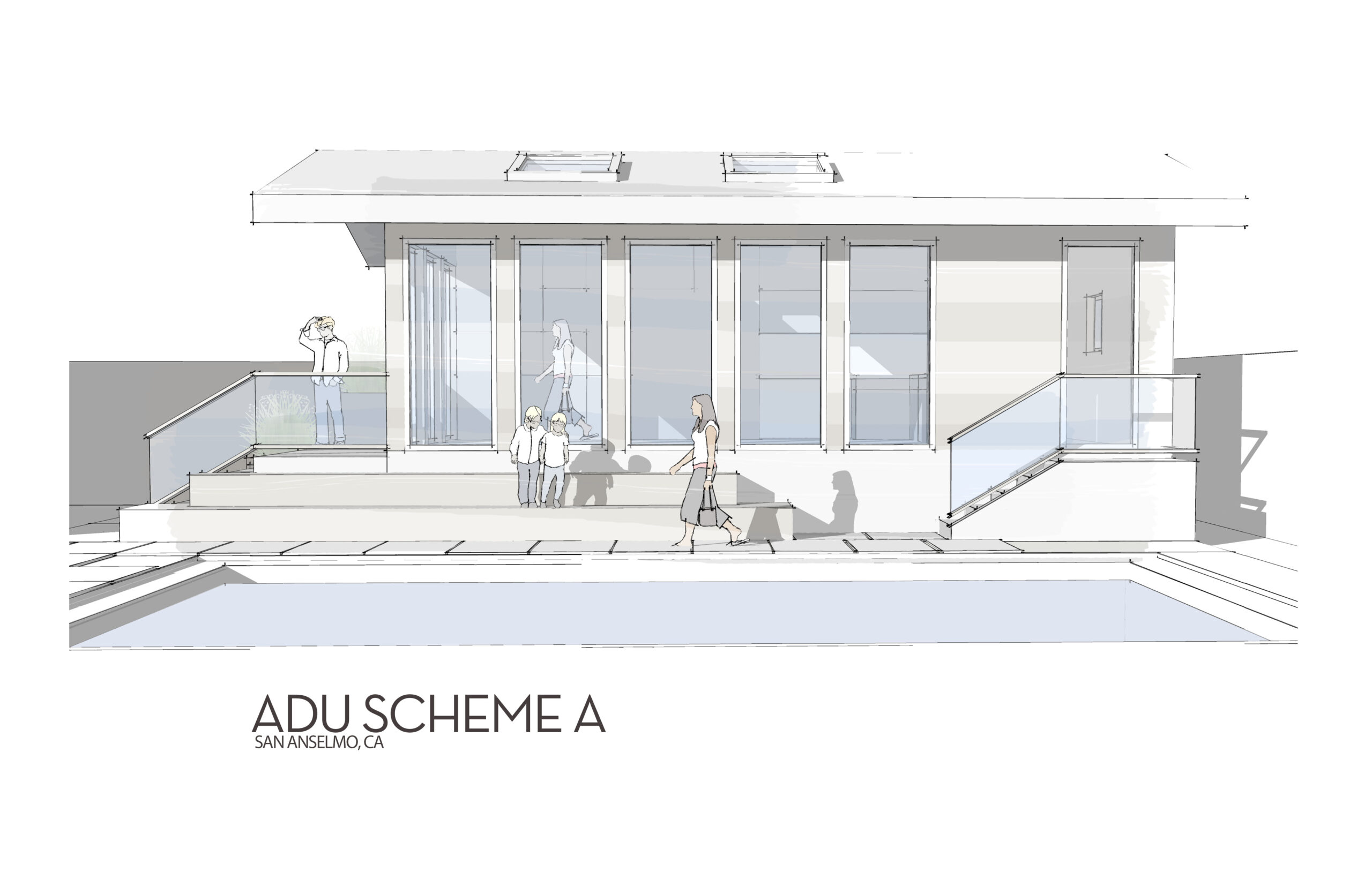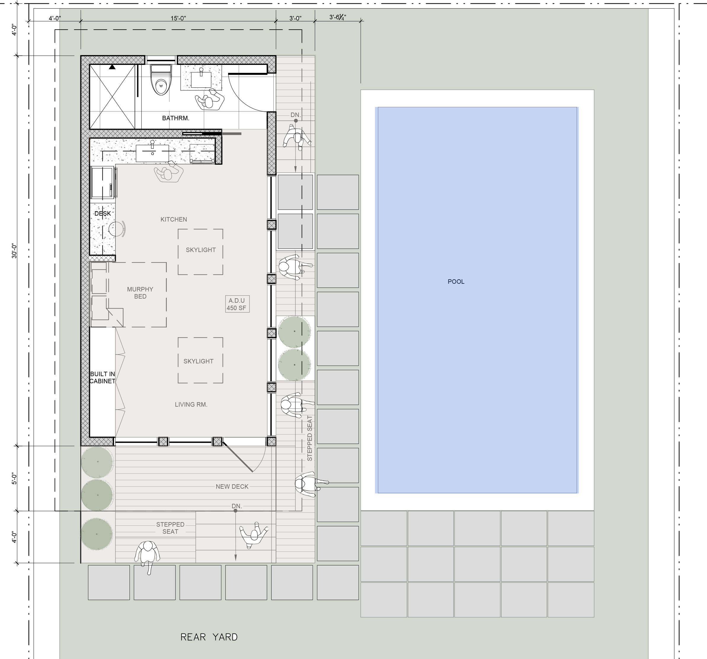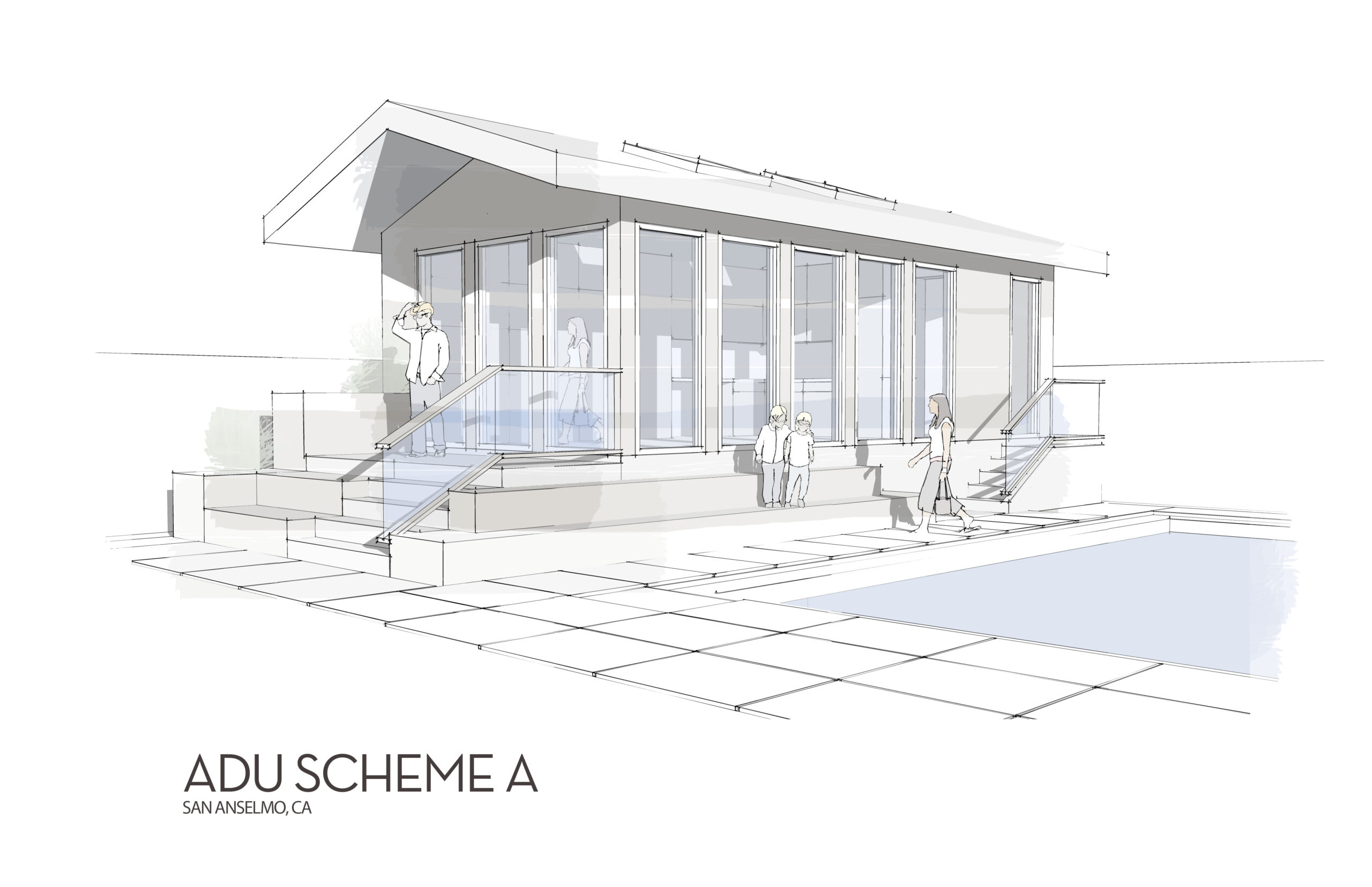 PROJECT OVERVIEW: THIS PROPOSAL FOR A REAR YARD NEW ACCESSORY DWELLING UNIT IN SAN ANSELMO BROUGHT FORWARD A 450 SF UNIT FILLED WITH NATURAL LIGHT AND SHARED SPACES. THE COMBINED LIVING AND SLEEPING SPACE WERE DESIGNED WITH A MURPHEY BED IN A WALL OF STORAGE WHILE THE OUTDOOR SPACE HAS SHARED LANDSCAPING AND SEATING AREAS AROUND THE EXISTING POOL.