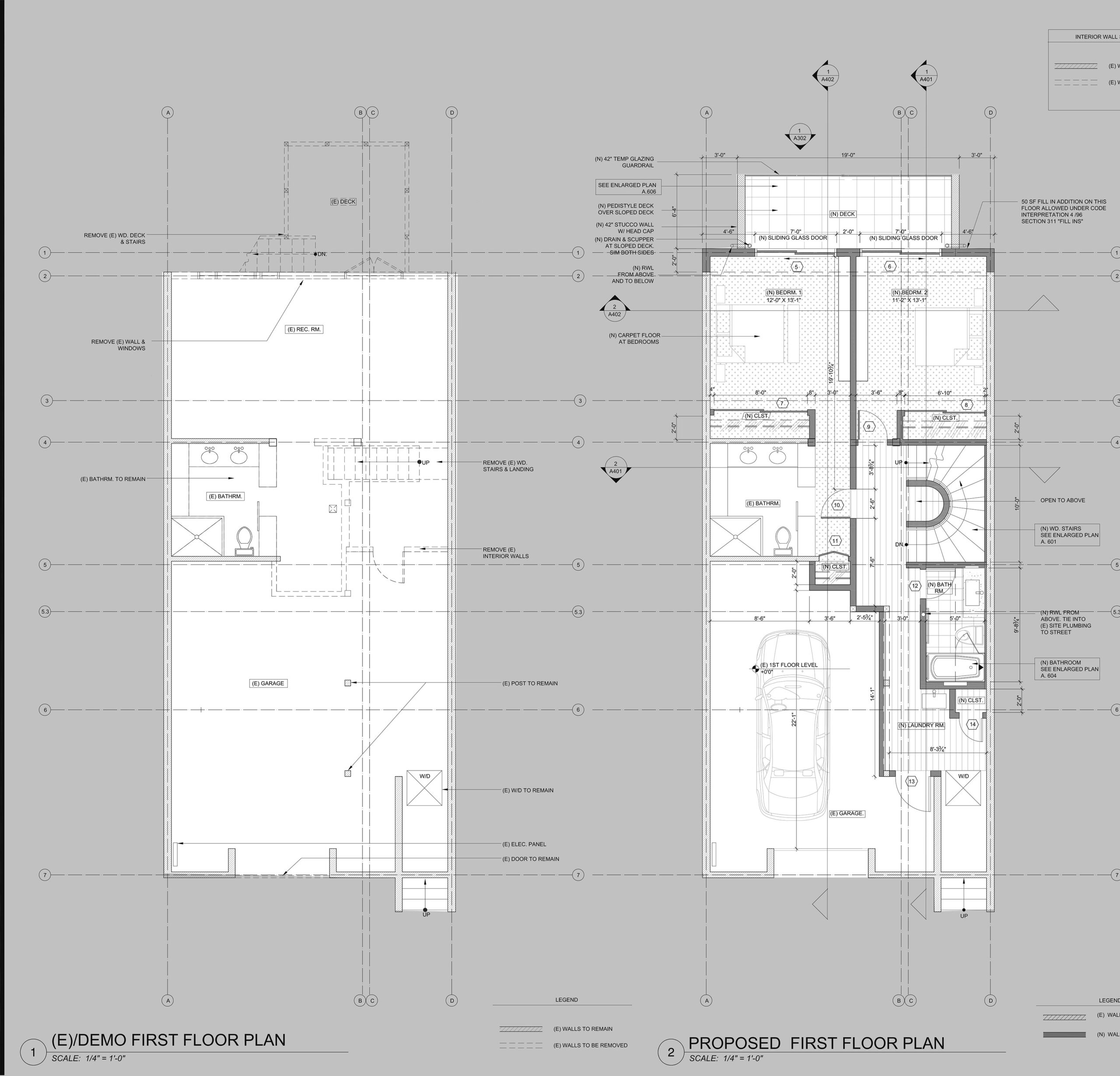 PROJECT OVERVIEW: THIS PROPOSAL FOR A SAN FRANCISCO HILLSIDE RESIDENTIAL REMODEL WAS CENTERED AROUND A NEW CURVED STAIRCASE CONNECTING A NEW EXCAVATED LOWER LEVEL, GARAGE LEVEL WITH 2 NEW BEDROOMS + BATHROOM & UPPER LEVEL WITH NEW KITCHEN AND BATHROOM. 2 LEVLS OF CATILEVERED DECKS PROJECT OFF THE REAR ELEVATION