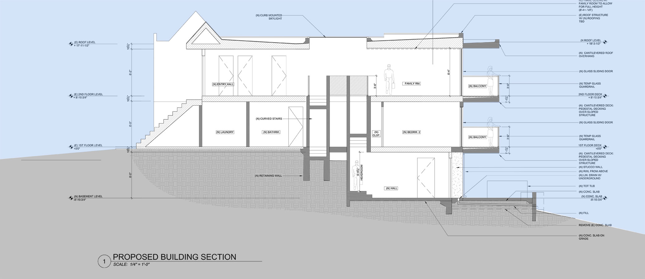 PROJECT OVERVIEW: THIS PROPOSAL FOR A SAN FRANCISCO HILLSIDE RESIDENTIAL REMODEL WAS CENTERED AROUND A NEW CURVED STAIRCASE CONNECTING A NEW EXCAVATED LOWER LEVEL, GARAGE LEVEL WITH 2 NEW BEDROOMS + BATHROOM & UPPER LEVEL WITH NEW KITCHEN AND BATHROOM. 2 LEVLS OF CATILEVERED DECKS PROJECT OFF THE REAR ELEVATION