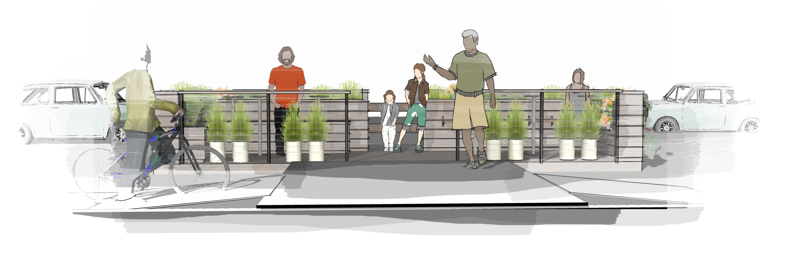PROJECT OVERVIEW: THIS NEW PARKLET ON VALENCIS STREET IN SAN FRANCISCO’S MISSION DISCTRCIT WAS THE FIRST OF ITS KIND TO INCOPERATE A FLOATING DESIGN WITH A BIKE LANE ALONG THE CURB AND THE PARKLET SITTING TEN FEET OFF THE CURB. THE DESIGN WORKED WITH SF PUBLIC WORKS TO INSURE A SAFE PASSAGE WAY FOR PEDESTRIANS ACCESSING THE PARKLET WITH A RAISED RAMP ACROSS THE BIKE LANE.